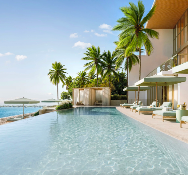 - Ground-level waterfront pool with bar and cabanas